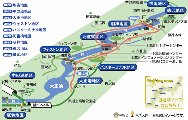 一般到上高地的旅遊團, 都是直接坐車到總站河童橋, 然後在附近晃晃, 最多走一小段步道便離開了, 不過這麼美的地方, 走馬看花是有點可惜, 我建議是跟我們一樣, 從大正池站下車後, 以大正池為起點, 沿著梓川往河童橋前進, 然後繼續往明神池方向, 過明神橋後返回河童橋搭巴士離開 (下圖紅色路線), 這樣整個走一圈大約需要5個小時左右, 雖然加上搭車時間, 需要花上一天, 但是絶對值得喔.