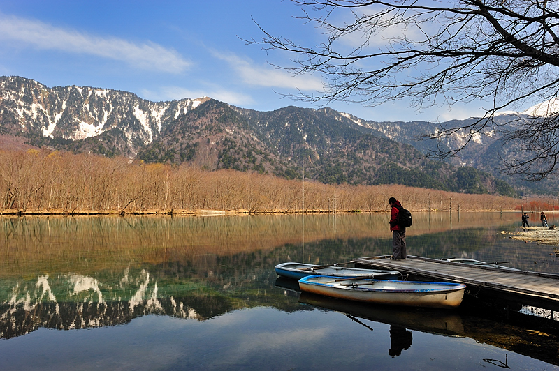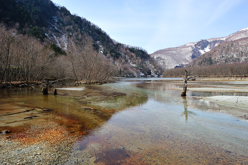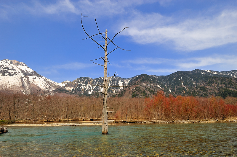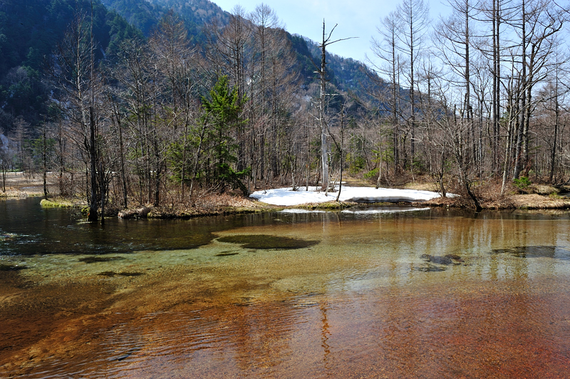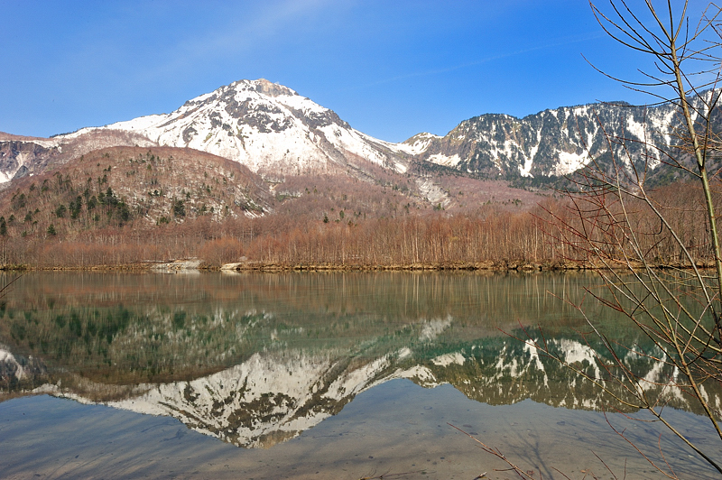 上面相片中白雪靄靄的山, 便是大名鼎鼎的燒岳, 燒岳是一座活火山, 而大正池就是在1915年時, 燒岳火山大爆發, 大量的土石堵塞梓川而形成的水池
