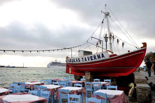 (港口邊的 Taverna, 那艘船上掛的是當地主食之一, 章魚)