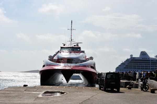 這次我從聖托里尼來到米克諾斯, 搭乘的是 Hellenic Seaways 的 Flyingcat 4, 這是一種雙體船, 好像也可叫作水翼船, 也就是有二邊像翅膀的支架將船身撐起, 這種船速度很快, 但比起一般的單體渡輪, 如果遇到海相不佳就會比較搖晃.