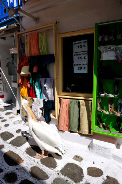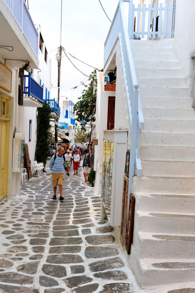 鎮上有許多精緻的紀念品小店, 也可以品嚐美味的Souvlaki Pita (用烤餅包著串燒肉類的傳統小吃), 走著走著, 突然就爬上了山坡, 視野一下子開濶了起來, 又 過一會, 郤又到了海邊, 很多地方你會不自覺得走過好幾次, 然後心裡納悶, 這家店我好像剛才走過, 這種迷路中的意外發現, 正是逛米克諾斯鎮的最大的樂趣所在.